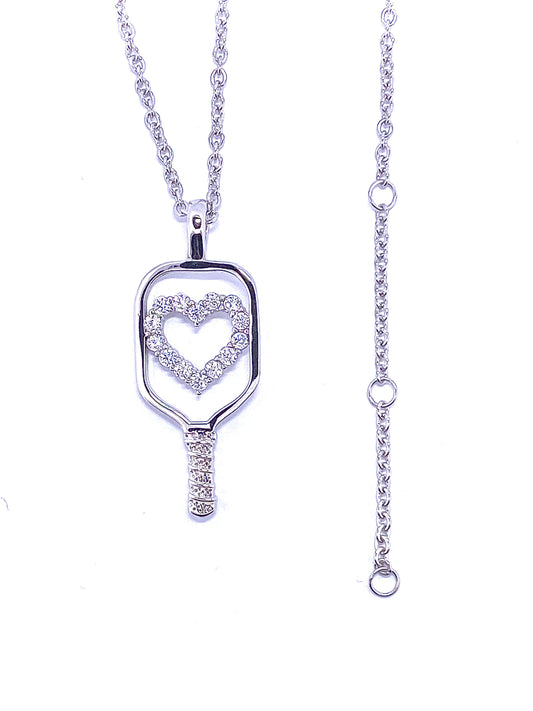 Large Sterling Silver and CZ Heart Pickleball Pendant including 2.3mm Sterling Silver Cable chain adjustable to wear at 16", 17" or 18"