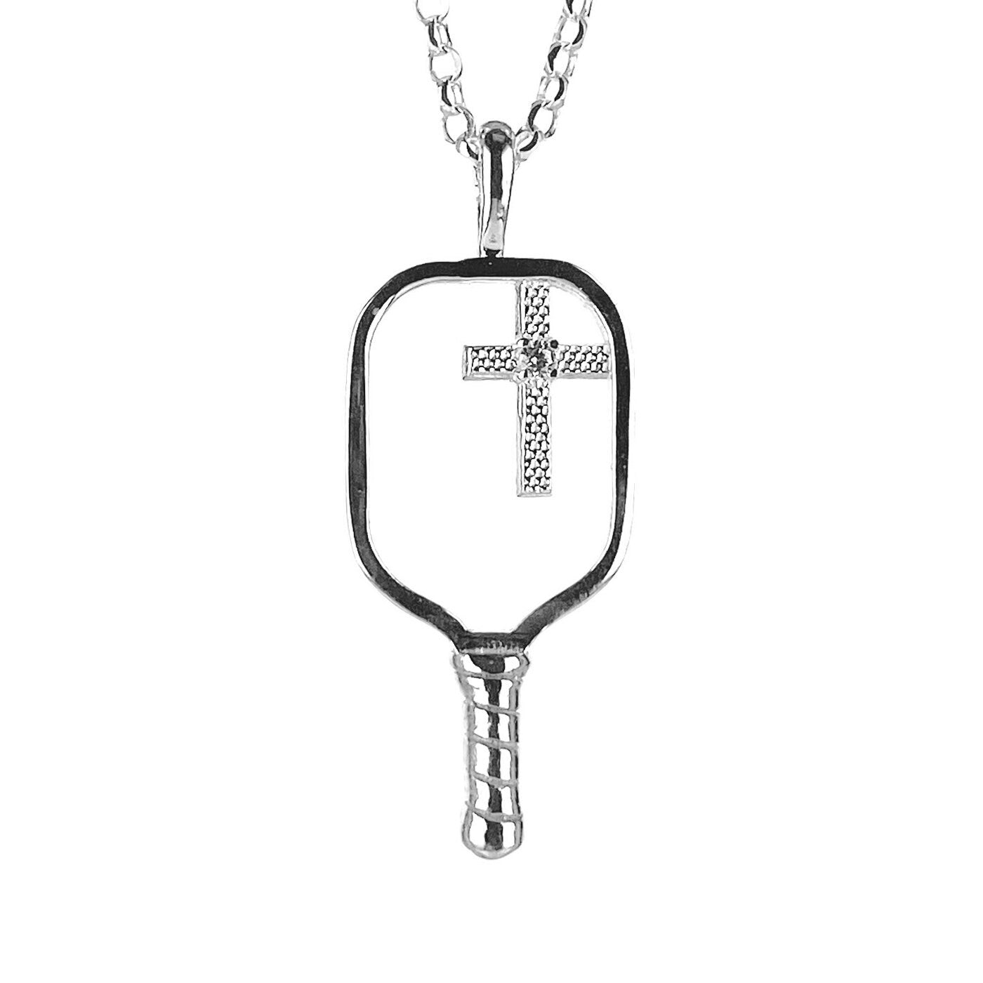 Sterling Silver & CZ pickleball pendant with Cross including your choice of Sterling Silver Cable Chain 1.5mm 16" or 18" chain, or 2.3mm , 18", 20" 22" or 24"